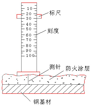 測試時,將測厚探針(見附圖4.1)垂直插入防火涂層直至鋼基材表面上,記錄標尺讀數(shù)。